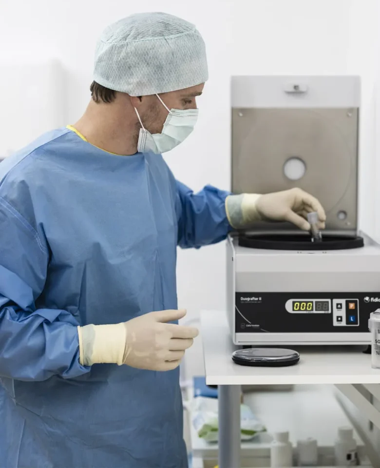 Ihre Fettzellen werden dann hochsteril direkt im Operationssaal in einer Zentrifuge bearbeitet. Daraus werden die Stammzellen gewonnen, die dann über eine Spritze, gegebenfalls mit Hilfe eines Röntgengerätes, in das betroffene Gelenk eingebracht und mit einem Pflaster abgedeckt werden. Die Entnahmestellen werden mit einer Naht verschlossen und einem Verband versorgt.
