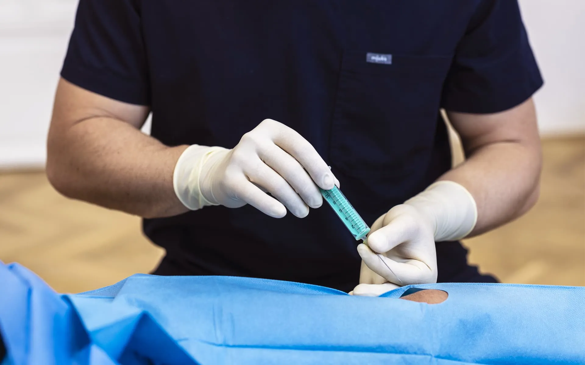 Unter leichter medikamentöser Entspannung und gut wirksamer medikamentöser Schmerztherapie nehme ich in zusätzlicher örtlicher Betäubung aus dem Unterhautfettgewebe des Bauchs oder der Hüft/Gesäßregion, je nach Einsatzgebiet ca. 100 ml Fettzellen. Dorthin gelange ich über einen kleinen Hautschnitt.